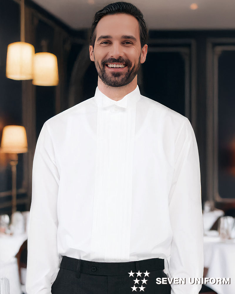 比翼の前立てに沿って裾までプリーツがある男性用のウィングカラーシャツです。タキシードやジャケットと合わせてフォーマルなシーンでのご利用がお勧め。衿後ろ蝶タイループ、織物生地の《ブロード》は、繊細な横畝が特徴の平織物。通気性と耐久性にも優れた素材。