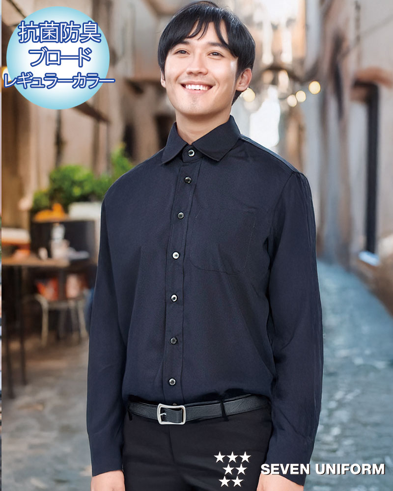 スッキリシルエットのセブンユニフォームのBASIC長袖シャツ。新定番シルエットとして開発された商品で、第一ボタンを外しての着用や、シャツの裾をアウトにしての着用も綺麗にきまるアイテムです♪ ボタンは安価に見えない貝調ボタンを採用しています! 織物生地の《ブロード》は、繊細な横畝が特徴の平織物。取り扱いの簡単なイージーケア素材です。抗菌防臭仕様。