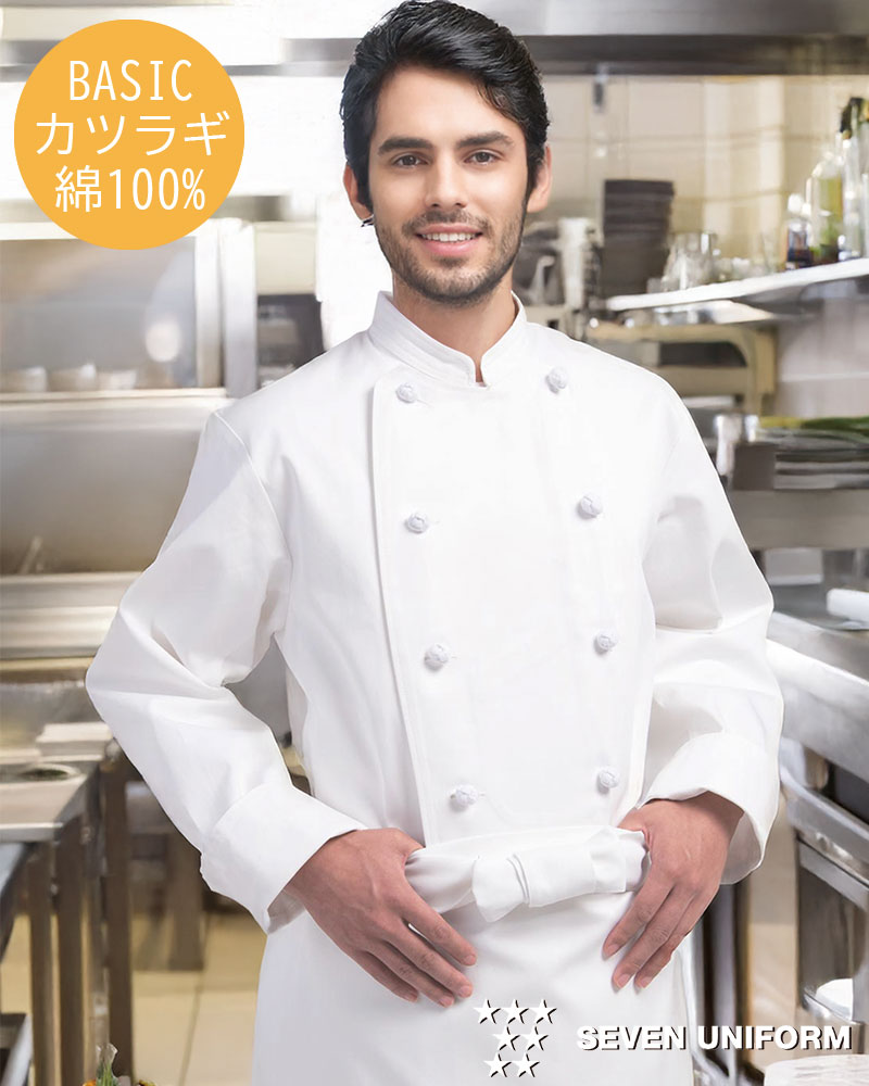 長く親しまれているセブンユニフォームのBASICコックコートです。肌触りと吸汗性、肉厚で丈夫な生地感は、カツラギ綿100%ならではの特徴。内掛けボタン、内ポケット、組紐ボタン仕様。織物素材の《カツラギ》は、綿100%の厚手生地で繰り返しの洗濯に強く、吸汗性に優れています。縦糸の密度が高く、綾目のある表情が特徴のスタンダード素材。