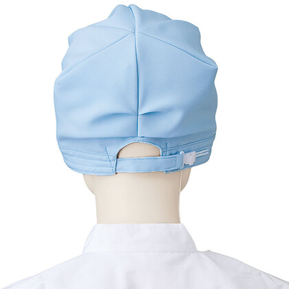 深めのかぶりで後頭部までしっかり覆える帽子です。ツバ:織芯、後ろ:アジャスター調整。平織素材の《制電ポプリン》は、衛生管理に対応した機能性素材。塩素系漂白剤による退色を防止する《フェードガードCℓ》加工・撥水撥油成分による高性能防汚《撥油SR》加工・制電・形態安定素材。