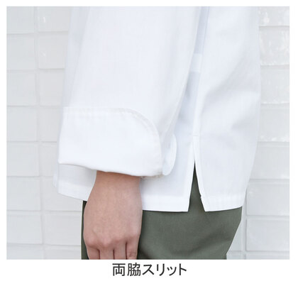 一番上のボタンを小さな組ひもボタン、その他をすっきりとした比翼ボタンにしたデザインコート。丈夫な中厚生地で、キッチンからフロアーまでマルチにご利用頂けます。左袖ポケット、両裾スリット入り。織物素材の《ツイル》は、耐久性に優れた綾組織の素材。ハリとコシのあるコックコートの定番素材。シワになりにくく、扱いやすいイージーケア素材です。ポリエステル65%、綿35%。