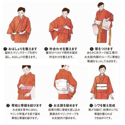誰でも簡単に綺麗な帯が締められるラーク加工♪予め形の整ったお太鼓(後ろの帯の結び目部分)にワンタッチテープ式の伊達〆が付いていて、着脱がとっても簡単です。※帯枕・帯板は関連商品からお買い求め下さい。