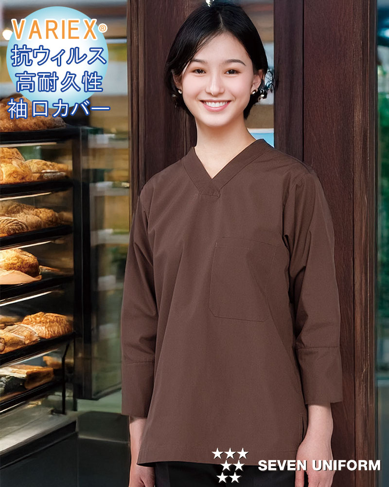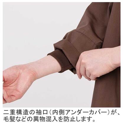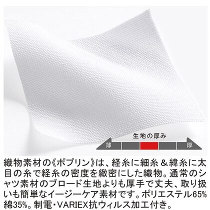 デパートの地下食料品店や街の惣菜店、ベーカリーなどに向けた、軽装備のHACCP対応ユニフォームです。袖口をリブ素材の二重構造にした毛髪混入予防、生地の抗ウィルス加工が特長。織物素材の《ポプリン》は、経糸に細糸&緯糸に太目の糸で経糸の密度を緻密にした織物。通常のシャツ素材のブロード生地よりも厚手で丈夫、取り扱いも簡単なイージーケア素材です。ポリエステル65%綿35%。抗ウィルス・制電素材。