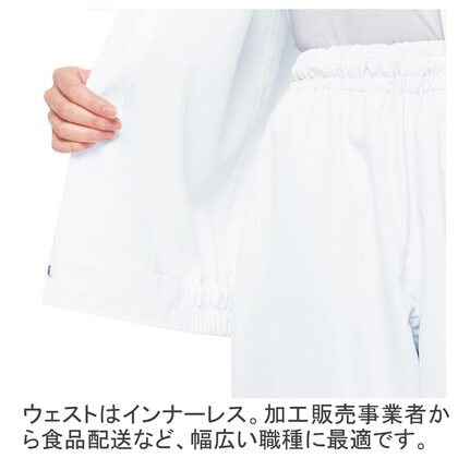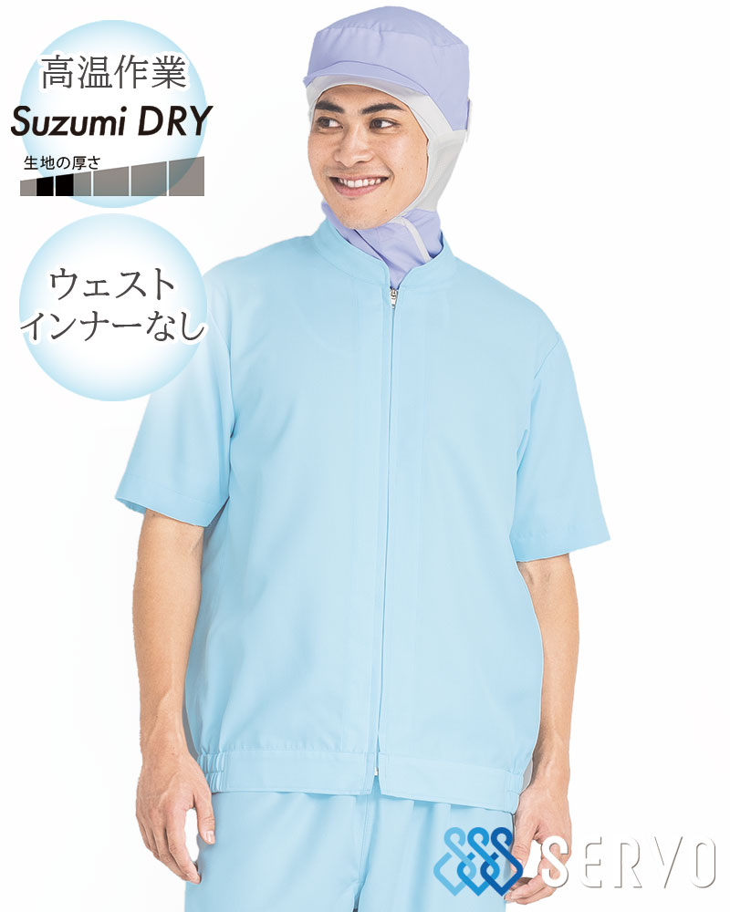 加工販売事業者から食品配送など、幅広い職種に対応したウェストインナーなしの半ジャンバーです。点タッチ設計でカナリ涼しい快適仕様。裾脇ゴム、セミオートコイルファスナー、巻き伏せ縫製、袖口メッシュ&鹿の子ニット(インナー)、ポケットなし仕様。織物素材の《涼みドライ》は、点タッチ設計で爽やか。肌離れがよく、ベトつきにく素材。素早く汗を拡散させる高い速乾性があります。