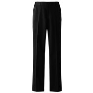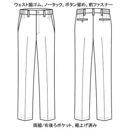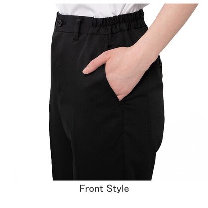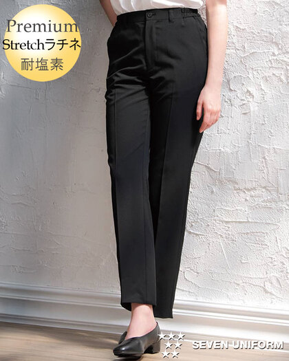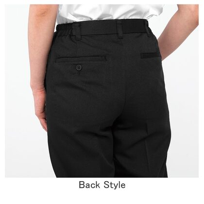 塩素漂白、日光、経年劣化により色落ちしやすかった従来の黒パンツ。原料段階で着色された黒原着糸を使用することで問題の解決をした女性用パンツです。ストレッチ性の高い高級素材を使用しています。ウェスト脇ゴム、ノータック、両腰/両後ポケット付き。織物生地の《ラチネ》は、ラチネ織りのリッチな色合いと柔らかな肌触りで、梳毛スーツ地のような高級感があります。ポリエステル100%。制電・ストレッチ・耐塩素素材。