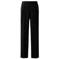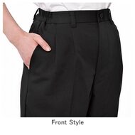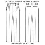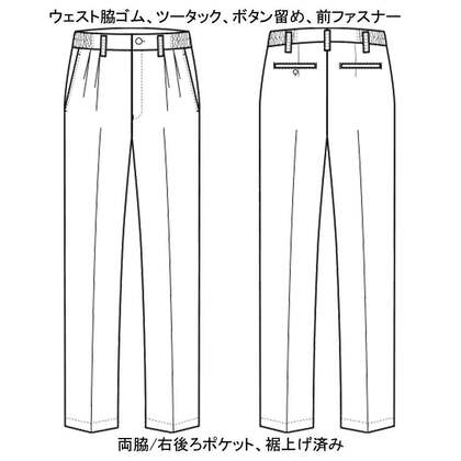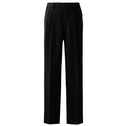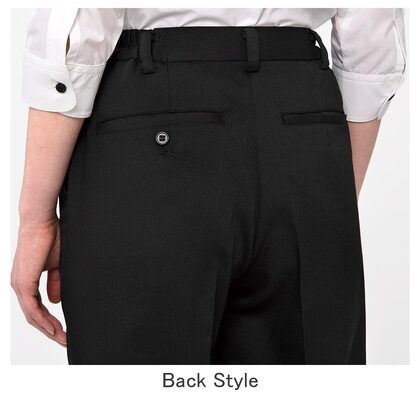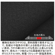 塩素漂白、日光、経年劣化により色落ちしやすかった従来の黒パンツ。原料段階で着色された糸の仕様で問題を解決をした男女兼用ゆったりパンツです。ストレッチ性の高い高級素材を使用しています。ウェスト脇ゴム、ツータック、両腰/両後ポケット付き。織物生地の《ラチネ》は、ラチネ織りのリッチな色合いと柔らかな肌触りで、梳毛スーツ地のような高級感があります。ポリエステル100%。制電・ストレッチ・耐塩素素材。