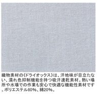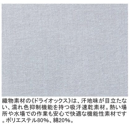 汗をかいてもすぐ乾く、気になる汗染みを予防するオックスフォードシャツ。淡い色合いのシャツでも汗が気にならない商品です。素材の質感はカジュアル感があり、綿混の優しい肌触り。織物素材の《ドライオックス》は、汗地味が目立たない、濡れ色抑制機能を持つ吸汗速乾素材。熱い場所や水場での作業も安心で快適な機能性素材です。ポリエステル80%、綿20%。