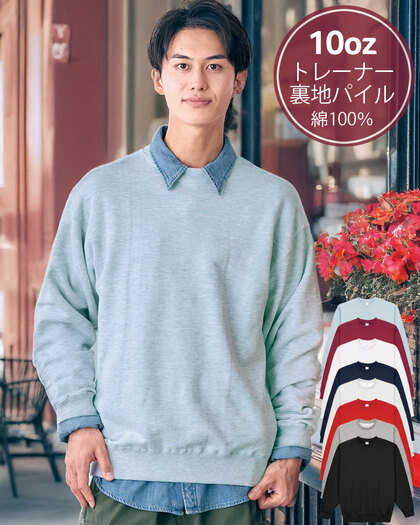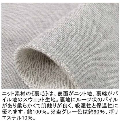 何にでも合わせやすいBASICなトレーナー。コットン100%ならではの肌触りに、裏パイルでドライな生地感が魅力です。ニット素材の《裏毛》は、表面がニット地、裏綿がパイル地のスウェット生地。裏地にループ状のパイルがあり柔らかくて肌触りが良く、吸湿性と保温性に優れます。綿100%。杢グレー色は綿90%、ポリエステル10%。
