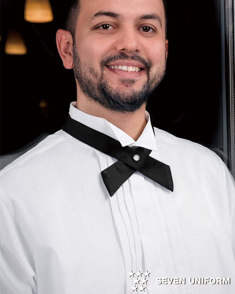ドットボタン留め、サイズ調整も後ろDカンで簡単なクロスタイ。蝶タイを略したデザインで、パーティーやサービス現場など華やかなシーンでの着用におすすめです。サテン織りによる上品な光沢が、本物のシルクのような高級感を演出します。ポリエステル100%素材のため扱いやすく、耐久性にも優れた商品。