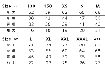 XXL ¥100 、 XXXL ¥200 、 4XL ¥300