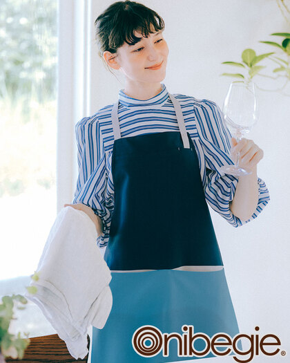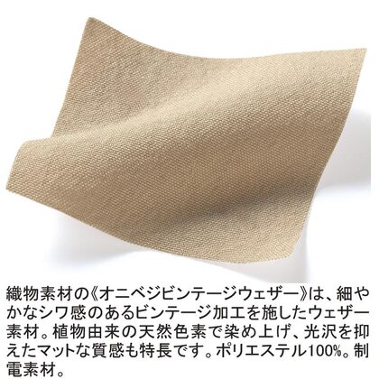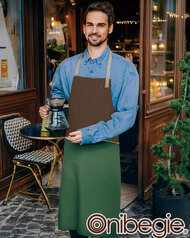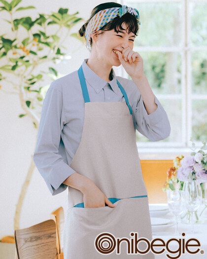 軽快な首掛けタイプ、2色の鮮やかな色使いとビンテージ感のあるお洒落生地を使用したビブエプロンです♪ 左胸/両腰ポケット、肩口サイズ調整。織物素材の《オニベジビンテージウェザー》は、細やかなシワ感のあるビンテージ加工を施したウェザー素材。植物由来の天然色素で染め上げ、光沢を抑えたマットな質感も特長です。ポリエステル100%。