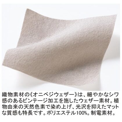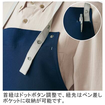 軽快な首掛けタイプ、2色の鮮やかな色使いとビンテージ感のあるお洒落生地を使用したビブエプロンです♪ 左胸/両腰ポケット、肩口サイズ調整。織物素材の《オニベジビンテージウェザー》は、細やかなシワ感のあるビンテージ加工を施したウェザー素材。植物由来の天然色素で染め上げ、光沢を抑えたマットな質感も特長です。ポリエステル100%。