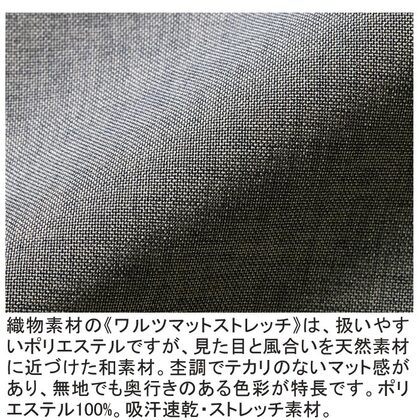 快適なストレッチと吸汗速乾で動きやすい、和素材を使用したイージーパンツです。ウェスト総ゴム(ひも入り)、両脇ポケット付き。織物素材の《ワルツマットストレッチ》は、扱いやすいポリエステルですが、見た目と風合いを天然素材に近づけた和素材。杢調でテカリのないマット感があり、無地でも奥行きのある色彩が特長です。ポリエステル100%。