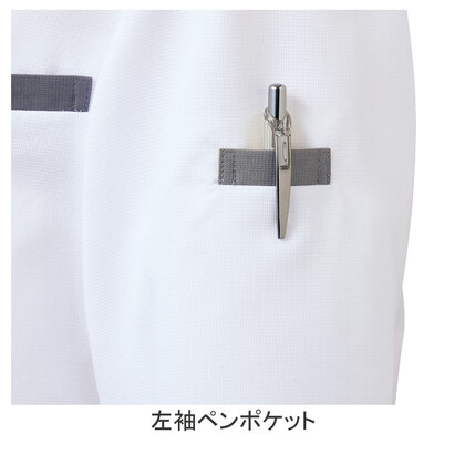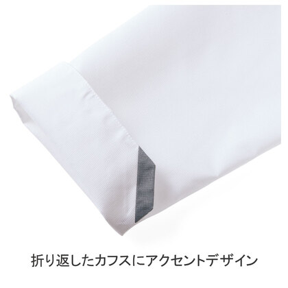 校倉構造の優れた通気性で、涼しく軽い、快適コックコートです。低めのスタンドカラーにデザイン性のあるアクセントカラーで、機能性とファッション性のあるお洒落なコックコートです。左胸ポケット、左袖ペンポケット、着脱が簡単なスナップボタン仕様。織物素材の《アゼッククール》は、厨房の厚さ対策に特化した校倉構造の軽量&通気性素材。動くたびに空気が流れる生地構造と、吸汗速乾の異形断面糸によるCOOLMAX仕様。