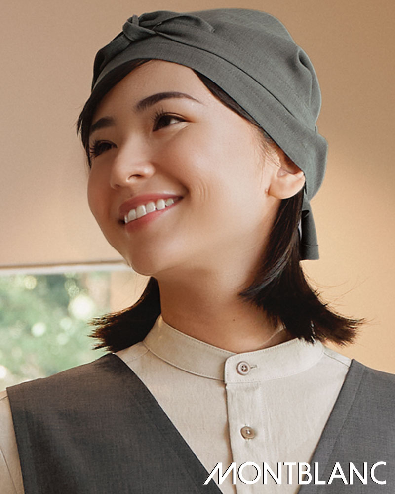 前結び、後ろ結び、双方のアレンジができるバンダナです。織物素材の《ワルツマットストレッチ》は、扱いやすいポリエステルですが、見た目と風合いを天然素材に近づけた和素材。杢調でテカリのないマット感があり、無地でも奥行きのある色彩が特長です。ポリエステル100%。