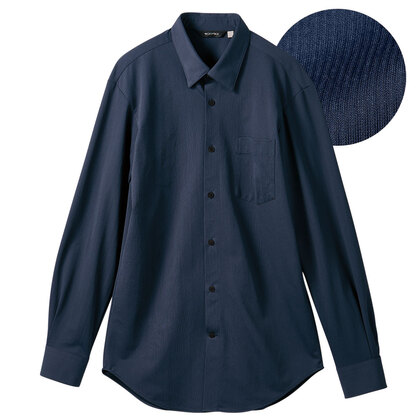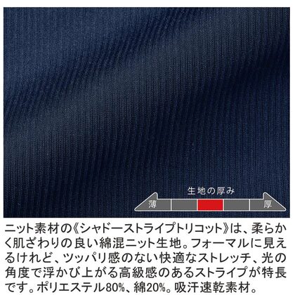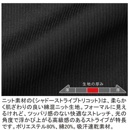 コスパが良い、動きやすい、美シルエット。光や角度によって見えるシャドーストライプ、贅沢なニット素材を使用したUNISEXシャツ。ぜひ一度お試しいただきたい商品です。衿はきちんと見えて堅苦しさもない、隠しボタンダウン付き。ボタンをとめなくても着用が可能です。素材の《シャド-ストライプトリコット》は、柔らかく肌ざわりの良い綿混ニット生地。ポリエステル80%、綿20%。吸汗速乾素材。
