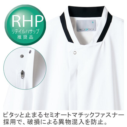 スーパーマーケットの厨房用に開発されたHACCP対応コートです。スマートなデザインに、異物混入を防止する袖口デザインやファスナー、快適な首もとや、肩回りが楽でもきちんと見える後ろラグラン仕様など、現場の要望に応えた機能性が自慢です。ニット素材の《ライトストレッチトリコット》は、軽量でストレッチ、汗をかいてもベタつかないドライな着心地が特長。長い時間の作業でも快適に過ごせる機能性が充実しています。