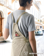 ユニフォームではあまり目にしない、デザイン性に富んだ胸当てエプロンです。着丈は前中心110㎝のひざ下までのロング丈、背中の当て布にはお店のロゴ刺繍が可能です♪ 胸ポケット、フロントカンガルーポケット付き。織物素材の《シーチング》は、太番手で織られたざっくりとした平織物。糸芯をポリエステル、その周りをコットンで包み込み、綿の心地よさと、ポリエステルの耐久性や速乾性、形状安定性が特長。