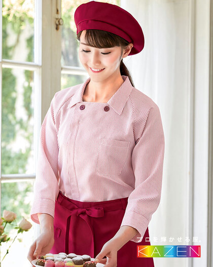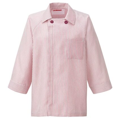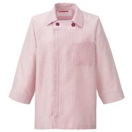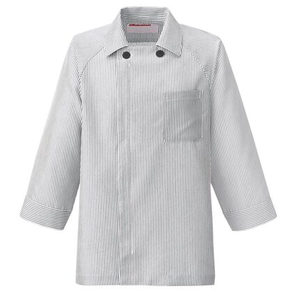 シンプルスタイルにストライプ柄の男女兼用のコックシャツです。きちんと並ぶフロントのカラーボタンがアクセントで、8分袖の袖口はスリット入りで軽快な印象です。左胸ポケット付き、袖口スリット入り。織物素材の《ウィンカーストライプ》は、長短複合組織による上品な光沢感のあるストライプ柄が特徴。凸凹状の組織により、肌離れに優れた爽やかな着心地です。(生地厚:★★☆☆☆)