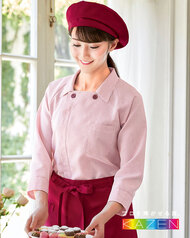 キュート&清潔感を演出するパステルカラーのコックシャツ。小ぶりのスタンドカラー、キュートなパブスリーブ、爽やかなパステルカラーが目を引きます。カフェやスイーツにお勧めの一着です。左胸ポケット付き、袖口スリット入り。織物素材の《ポプリン》は、表面になめらかな光沢があり、肌触りの良い素材。綿混紡素材でも洗濯後の縮みやシワを抑制しています。O-157に対応した制菌素材♪(生地厚:★★☆☆☆)